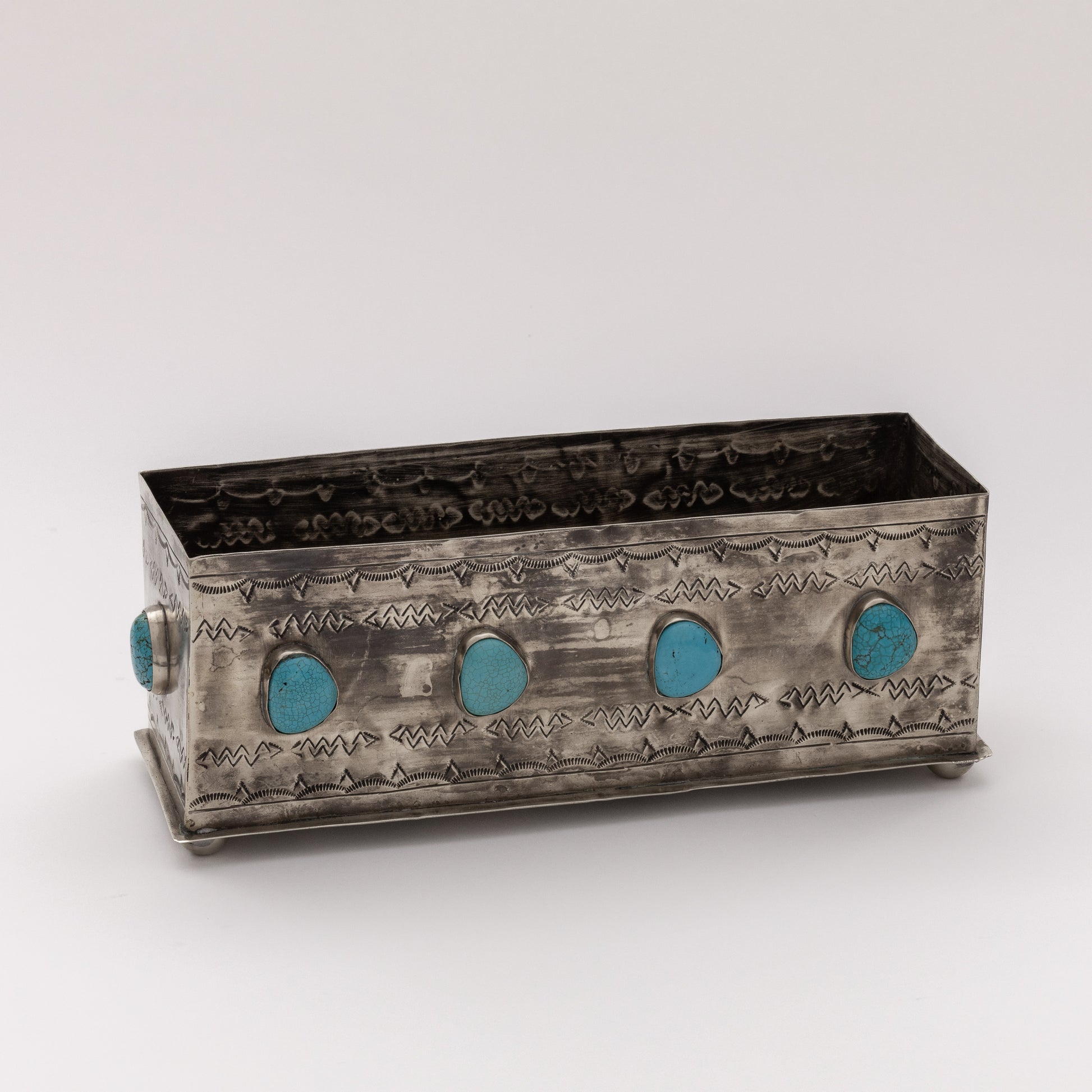 Introducing the J. Alexander Rustic Silver Stamped Planter with Turquoise, a stunning addition to your home decor. This handcrafted piece is inspired by the traditional craftsmanship of Navajo silversmiths, featuring a vintage finish that exudes authenticity and timeless charm.